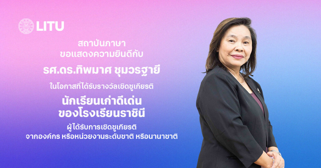 สถาบันภาษา ขอแสดงความยินดีกับ รองศาสตราจารย์ ดร.ทิพมาศ ชุมวรฐายี ในโอกาสที่ได้รับรางวัลเชิดชูเกียรติ “นักเรียนเก่าดีเด่น” ของโรงเรียนราชินี ประเภทผู้ได้รับการเชิดชูเกียรติจากองค์กร หรือหน่วยงานระดับชาติ หรือนานาชาติ