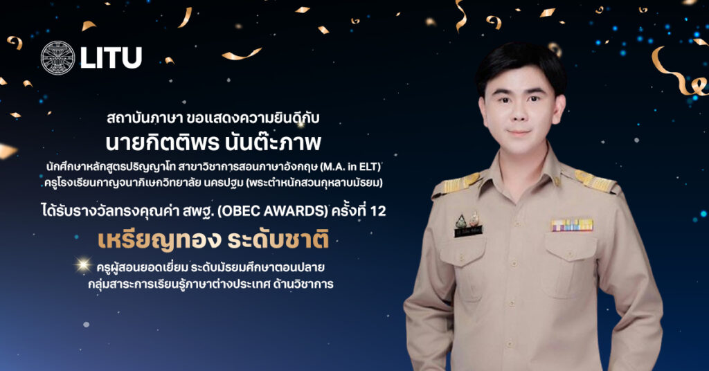 สถาบันภาษาขอแสดงความยินดีกับ นายกิตติพร นันต๊ะภาพ นักศึกษาหลักสูตรปริญญาโท สาขาการสอนภาษาอังกฤษ (M.A. in ELT) และครูโรงเรียนกาญจนาภิเษกวิทยาลัย นครปฐม (พระตำหนักสวนกุหลาบมัธยม) ในโอกาสได้รับ รางวัลเหรียญทอง ระดับชาติ จากการประกวดรางวัลทรงคุณค่า สพฐ. (OBEC AWARDS) ครั้งที่ 12 ประเภท ครูผู้สอนยอดเยี่ยม ระดับมัธยมศึกษาตอนปลาย กลุ่มสาระการเรียนรู้ภาษาต่างประเทศ (ด้านวิชาการ)