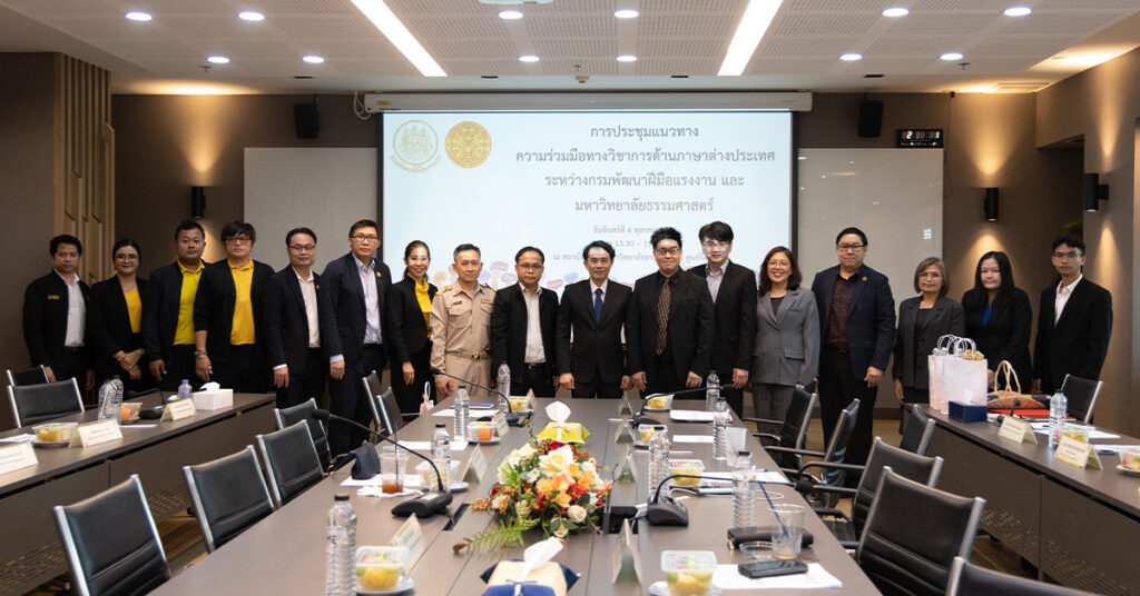 มหาวิทยาลัยธรรมศาสตร์ นำโดย รศ.ดร.ดำรงค์ อดุลยฤทธิกุล รองอธิการบดีฝ่ายวิชาการ พร้อมด้วย รศ.ดร.ศุภกรณ์ ภู่เจริญศิลป์ ผู้อำนวยการสถาบันภาษา รศ.ดร.สุพงศ์ ตั้งเคียงศิริสิน ผู้อำนวยการศูนย์ทดสอบสถาบันภาษา ผศ.ดร.ศิริรัตน์ ณ ระนอง คณบดีคณะศิลปศาสตร์ และ รศ.ดร.คม คัมภิรานนท์ คณบดีวิทยาลัยนวัตกรรม ร่วมประชุมกับคณะผู้บริหารและบุคลากรจากกรมพัฒนาฝีมือแรงงาน ณ ห้องประชุมชั้น 3 สถาบันภาษา มหาวิทยาลัยธรรมศาสตร์ ศูนย์รังสิต