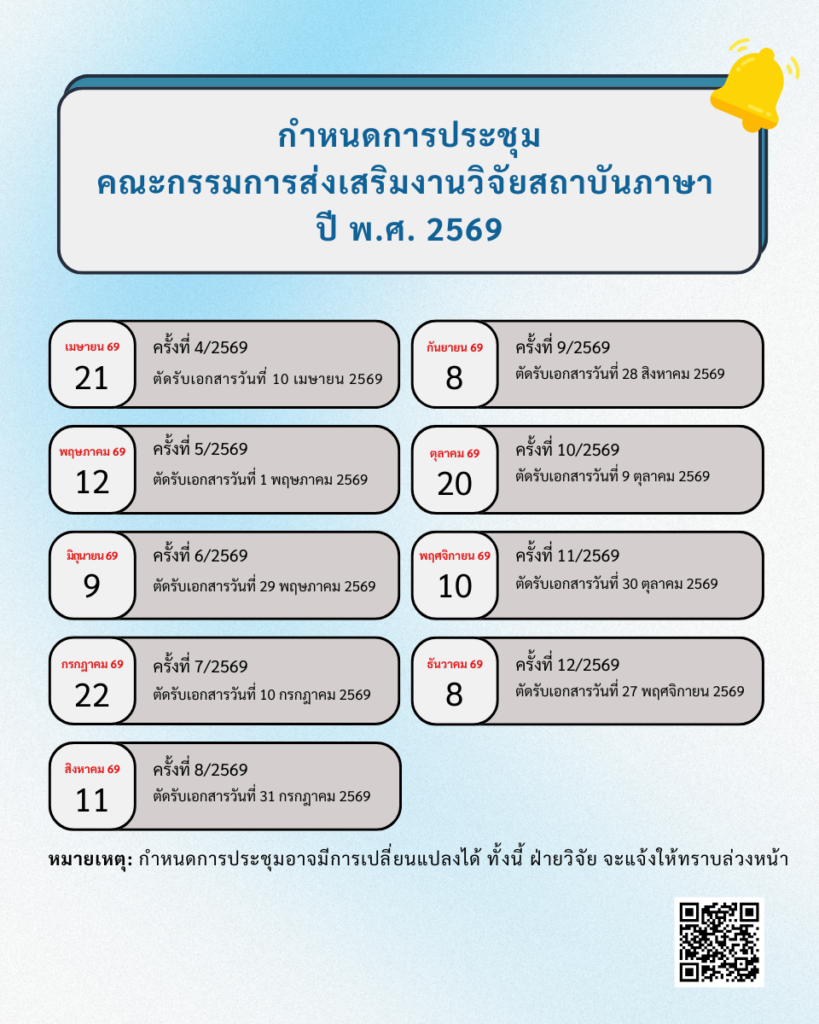 บันทึกข้อความแจ้งกำหนดการประชุมคณะกรรมการส่งเสริมงานวิจัยสถาบันภาษา ปี พ.ศ. 2569 และวันตัดรับเอกสารประกอบการพิจารณา
